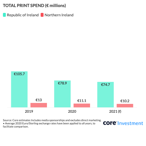 The print industry was significantly impacted by Covid-19 in 2020. As restrictions were implemented, advertising revenue declined across numerous revenue sources including classified advertising, SMEs and local advertisers. This impacted both national and local print titles.In the Republic of Ireland, total investment in print advertising fell by 25.3% to €78.9 million. We estimate that ad revenue across the national titles fell by 23.5% to €65.7 million. There was also a contraction in digital revenue, which we estimate was in the region of €21.1 million, a decline of 13.9%. Overall regional press spends fell by approximately 22%, last year.We are forecasting a further decline in revenues in 2021, albeit at a much slower rate. The overall print market is expected to decline by 5.3% to €74.7 million, but digital revenue for national titles is expected to increase by 8% this year to €22.8m.Print advertising revenue fell by 14.6% to £9.9 million (€11.1m) in Northern Ireland last year. Revenue would have been more severely impacted were it not for significant advertising activity from the UK government. We are predicting further declines in 2021, with advertising investment in print expected to fall by 8.1% to £9.1 million (€10.2m).As mentioned earlier in this report, the most important industry development this year is the work being carried out by the Future of Media Commission. The timing of the Commission’s work coincides with developments around the world regarding how news should be paid for by online platforms – Google and Facebook in particular.Developments in Australia surrounding the introduction of its News Media and Digital Platforms Mandatory Bargaining Code have been watched carefully by governments across the globe.The purpose of the Australian code is to force technology platforms to pay publishers for news content made available or linked on their platforms. The code’s main provision is that platforms should negotiate with publishers in good faith, and where parties cannot come to an agreement, an arbitration panel will intervene.The introduction of the code created a lot of noise and posturing on all sides, including Facebook temporarily blocking news content on its platforms in Australia. This action damaged Facebook’s reputation but did enable it to secure some ‘last minute’ concessions such as the inclusion of a two-month mediation period.Critics of the Australian solution say that it favours big publishers and that local media will lose out. The Future of Media Commission needs to address this issue in its recommendations here. Ireland’s local publishers are an important part of the media landscape, but they are struggling to stay afloat.The EU has various pieces of related legislation in the works (such as the Copyright Directive, Digital Services Act and the Digital Markets Act) which could be amended to include aspects of the Australian reforms if members wish. The publication of the Commission's report this summer could be useful stimulus in this regard.